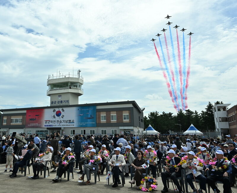 공군은 9월 13일(금) 공군 강릉기지 주기장에서 공군작전 전승기념행사를 개최했다. 공군은 6.25전쟁 중 성공적인 작전들을 기념하고, 전쟁 중 산화한 호국영령들을 추모하기 위해, 1997년부터 매년 전승기념행사을 개최해오고 있다. 사진은 블랙이글스가 축하비행하고 있는 모습. (사진 공군)강릉기지는 6·25전쟁 당시 대한민국 공군 최초의 단독출격작전을 시작으로, 승호리철교 차단작전, 평양 대폭격작전, 351고지전투 항공지원작전 등 공군 3대 작전을 포함해 총 7,851소티의 임무를 성공적으로 수행한 역사적인 장소이다.