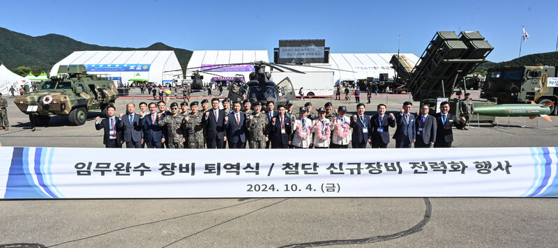 '임무완수 장비 퇴역식 및 첨단 신규장비 전력화 행사'에 참석한 주요관계관들이 기념사진을 촬영하고 있다. (사진 육군) 박안수(대장) 육군참모총장 주관으로 진행된 이날 행사는 주요관계관 및 6·25전쟁 참전용사 등 100여 명이 참석한 가운데 △1부 '임무완수 장비 퇴역식/첨단 신규장비 전력화 행사' △2부 '첨단무기 제병협동전투 시범'으로 나뉘어 2시간 동안 진행되었다.
