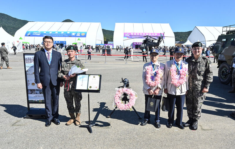 박안수 육군참모총장(제일 오른쪽)과 조현기 방사청 기반전력사업본부장(제일 왼쪽)이 '임무완수 장비 퇴역식'에서 57mm 무반동총을 운용했었던 참전유공자와 마지막으로 무반동총을 운용한 현역장병에게 화환과 꽃다발을 수여하며, 국가방위에 대한 헌신에 감사를 표하고 있다.(사진 육군)