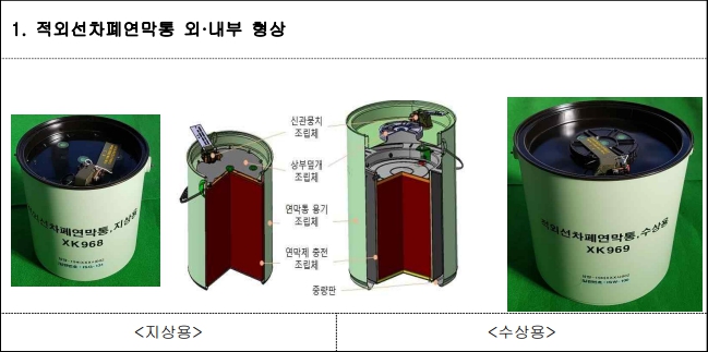 1980년 초부터 40여 년간 적의 시야로부터 우리군을 보호해온 KM5 백색연막통과 KM4A2 부유백색연막통은 가시광선만 차폐하여 적외선을 활용한 감시장비나 유도무기를 차단할 수 없는 한계가 있었습니다. 이에 따라 적외선차폐연막통의 필요성이 대두되어 지난 2020년 적외선차폐연막통을 우리 기술로 개발하였고 이번 최초 양산계약 체결을 거쳐 2025년부터 본격적으로 전력화에 돌입할 예정입니다.