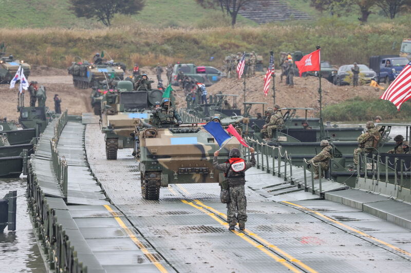 한국형 자주도하장비 수룡이 문교 형태로 K1A2전차를 도하시키고 있다. (사진 육군)지난 6월 전력화된 한국형 자주도하장비 '수룡'이 처음 투입된 이번 훈련은 엄중한 안보상황 속 한미 양국의 실전적 도하작전 능력을 향상시키고, 한미 도하자산의 상호운용성을 검증하는 데 중점을 두고 진행 중이다.