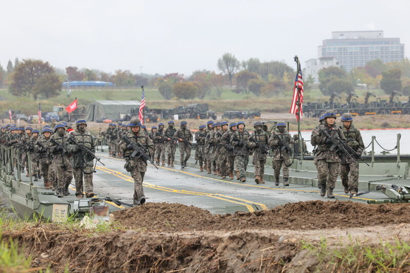 한미 장병이 함께 완성한 연합부교를 통해 K200장갑차가 도하하고 있다. (사진 육군)훈련은 부대별 예행연습 후 드론 및 무인수상정의 정찰과 포병사격으로 시작되었으며, 곧이어 아파치 공격헬기의 공중엄호 속에 K21보병전투장갑차 8대가 신속하게 강습도하를 실시하였다. 이어서, 한국형 자주도하장비 '수룡'이 차량에서 문교 형태로 순식간에 전환해 K1A2전차, K200장갑차 등을 도하시키기 시작했으며, 한미 공병부대 장병들이 리본부교와 개량형 전술부교를 뗏목처럼 이어 붙여 구축한 문교도 기갑전력의 도하에 투입되었다.