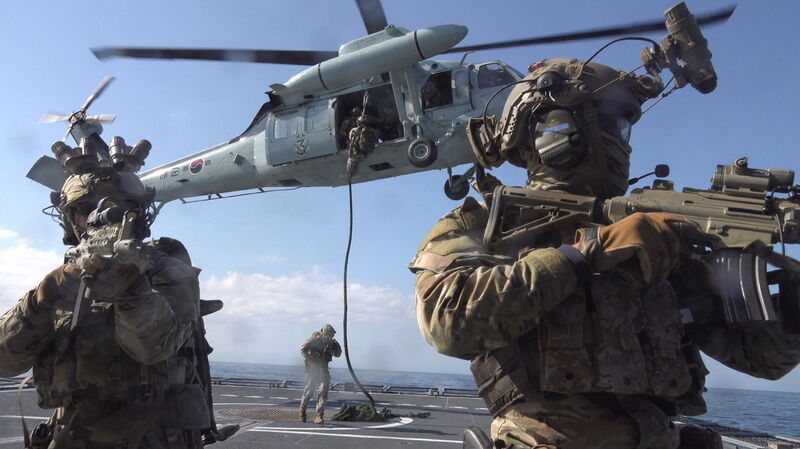 10월 25일, 2024 호국훈련 일환으로 실시한 동해상 합동해상기동훈련에 참가한 해군 특전대원들이 해양차단훈련을 위해 충무공이순신함(DDH-Ⅱ)으로 투입되고 있다. (사진 해군)