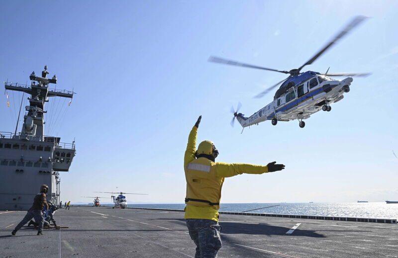 2월 10일 경남 거제 인근 해상에서 진행된 헬기 이·착함 자격 연합·합동훈련에서 경찰청 헬기가 해군 대형수송함 독도함(LPH, 14,500톤급) 비행갑판에 이·착함을 실시하고 있다. 헬기 조종사들은 이날 훈련을 통해 군 해상작전과 범부처 해상재난 대응 능력을 제고했다. 해군은 2011년부터 육·해·공군 합동으로 매 분기 훈련을 시행했으며, 범정부 차원의 해상재난 대응체계 강화를 위해 2020년 9월부터 경찰·소방·해경청까지 훈련 참가 범위를 확대했다.