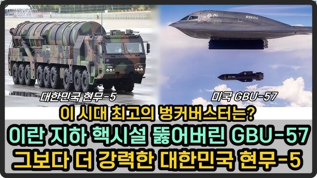 GBU-57 보유물량 이미 절반 이상 사용, 현무5 얼마나 있을까? 미군은 이란 포르도 핵시설을 공격하기 위해 B-2 스텔스 폭격기 동원해 최신 벙커버스터 'GBU-57' 투하. 이는 GBU-57 첫 실전 사용 사례. 포르도·나탄즈 핵시설은 매우 심각한 피해. GBU-57 벙커버스터는 GPS 기반으로 지하 60m까지 관통해 폭발하는 강력한 폭탄으로, 포르도 핵시설의 깊은 지하 구조를 파괴하기 위해 연속 투하.