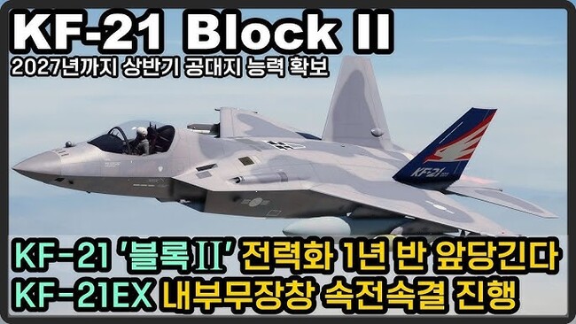 정부가 제170회 방추위에서 KF-21 공대지 능력(블록2) 전력화 시점을 당초 계획보다 앞당겨 2027년 상반기 조기 확보 목표로 추진. KF-21 블록2 공대지 능력 전력화, 전자전, 천룡, KTSSM, KGGB, IRIS-T, Meteor 등 탑재 미사일 탑재 및 발사 통합 목표' 조기 전력화가 의미하는 것 - 소프트웨어 우선 vs. 하드웨어 개조 KF-21EX 버전에선 내부무장창, 스텔스 강화 할 수 있는가?