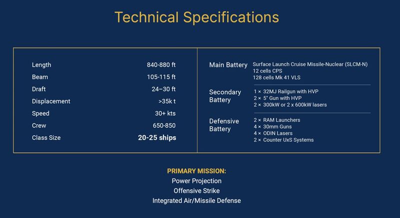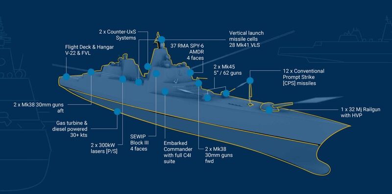 무장 구성도 파격적이다. 중거리 재래식 신속 타격(IRCPS) 극초음속 미사일, 신형 핵탄두 탑재 해상발사 순항미사일(SLCM-N), 전자기 레일건, 고출력 레이저 지향성 에너지 무기 등이 포함된다. 공개된 렌더링 이미지에는 선수·선미에 걸쳐 3개 대형 수직발사체계(VLS) 배열이 확인되며, 토마호크·스탠다드 계열 미사일과 극초음속 미사일 발사가 묘사돼 있다. 다수의 5인치 함포와 기타 재래식 함포도 탑재된다.