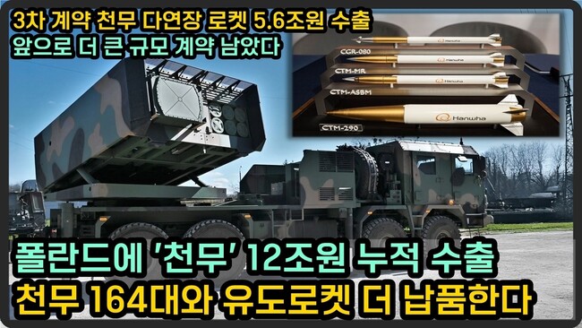 폴란드에 '천무' 12조 원 누적 수출, 앞으로 더 큰 규모로 천무 164대와 유도로켓 납품한다 한화에어로스페이스가 폴란드에 다연장 로켓 ‘천무’를 수출하는 5조6000억원 규모 계약을 맺었다. 총 세 차례 도입했는데 ▲1차 호마르K 기본공급과 80km급 유도 로켓 공급 . ▲72대 규모의 발사체(호마르K) 및 유도탄 공급 (현지장비 Topaz C4I, Jelcz 트럭) 연동체계확정. ▲사거리 80km CGR-080 유도탄 중심 공급. ▲천무 누적 12조 8천억원 290대 중 126대 도입.