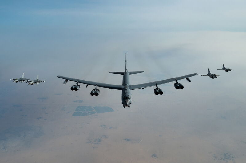 미 중부사령부 작전구역에서 2025년 11월 17일 실시된 다국적 연합훈련 ‘페로셔스 팰컨 6(Ferocious Falcon 6)’ 기간 중, 미 공군 제96원정폭격대대 소속 B-52 스트래토포트리스 폭격기가 카타르 공군 라팔 전투기(오른쪽)와 미 공군 F-16 전투기(왼쪽)와 함께 편대 비행을 하고 있다. 미 공군 중부사령부(AFCENT)는 최근 발표한 연례 평가에서 “2025년은 공세적 억제와 실전 중심 작전이 결합된 해였다”며 “미국과 동맹국의 공중작전 능력과 억제력이 실질적으로 입증됐다”고 밝혔다. AFCENT는 미 중부사령부(CENTCOM) 전구 내 공군 작전을 총괄하는 핵심 사령부다.