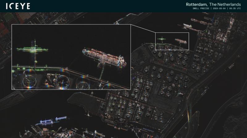 2024년 9월 초에 촬영된 네덜란드 로테르담 항구의 아이스아이 드웰 프리사이스 SAR 이미지. 확대된 이미지는 25cm 해상도의 드웰 프리사이스의 디테일을 보여준다. (사진 아이스아이)