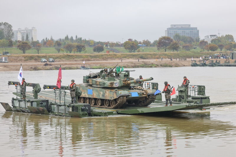 한국형 자주도하장비 수룡이 문교 형태로 K1A2전차를 도하시키고 있다. (사진 육군)지난 6월 전력화된 한국형 자주도하장비 '수룡'이 처음 투입된 이번 훈련은 엄중한 안보상황 속 한미 양국의 실전적 도하작전 능력을 향상시키고, 한미 도하자산의 상호운용성을 검증하는 데 중점을 두고 진행 중이다.