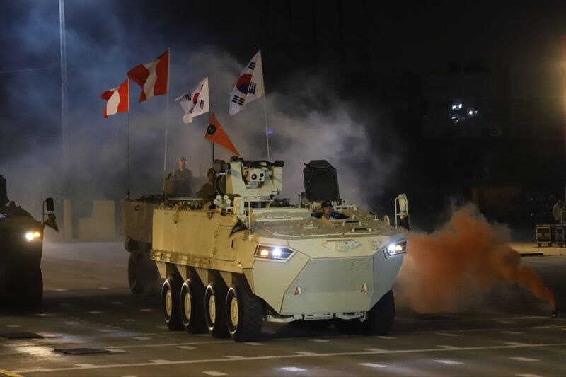 페루군 열병식에 등장한 K808 차륜형 장갑차 '백호' (사진 SA Defensa)남미의 군사전문매체인 "SA Defensa"에 의하면, 페루군 열병식에 K808 차륜형 장갑차 3대가 등장한 것으로 확인됐다. 3대 가운데 1대는 첨단 광학 장비가 결합된 원격사격통제체계와 드론을 전자적으로 마비시키는 안티드론건을 장착해 이목을 집중시켰다.