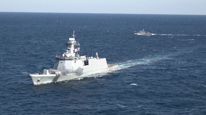 2025년 1월 3일 서해상에서 실시한 첫 해상훈련에서 해군 2함대 함정들이 대함사격을 실시하고 있다. 해군은 새해를 맞아 동, 서, 남해 전 해역에서 일제히 실시한 첫 해상훈련을 통해 필승의 전투의지를 고양하고 확고한 군사대비태세를 점검했다.