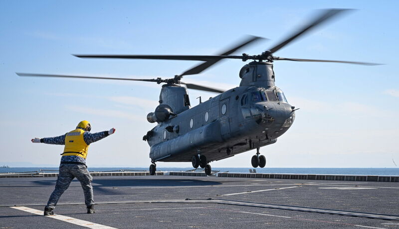2월 10일 경남 거제 인근 해상에서 진행된 헬기 이·착함 자격 연합·합동훈련에서 HH-47 공군 헬기가 해군 대형수송함 독도함(LPH, 14,500톤급) 비행갑판에 이·착함을 실시하고 있다. 헬기 조종사들은 이날 훈련을 통해 군 해상작전과 범부처 해상재난 대응 능력을 제고했다. 이날 훈련에는 독도함을 비롯해 육·공군 및 미2사단/한미연합사단 제2전투항공여단, 경찰·소방청 헬기 총 24대가 참가했다.