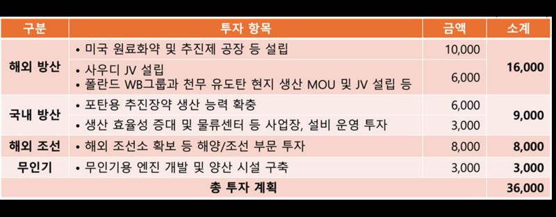 손 대표는 “집중적인 투자가 필요한 상황에서 차입 등의 방식으로 단기간에 부채비율이 높아지면 최근 빠르게 회복하는 유럽 방산업체와의 입찰 경쟁에서 불리해 유상증자를 선택했다”고 설명했다.  한화에어로스페이스는 유럽의 ‘방산 블록화’와 미국의 해양방산 및 조선해양 산업 복원에 대응하기 위해 3조6000억원의 자금으로 해외 방산 거점 및 조선소 등에 투자할 계획이다.