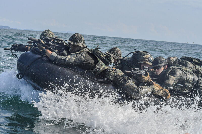 육군특수전사령부는 '25년 UFS/TIGER의 일환으로 25일부터 27일까지 태안 안면도 해상훈련장 일대에서 '한미연합 해상침투훈련'을 실시했다. 한미연합 특수작전능력 강화를 위해 실시된 이번 훈련에는 한미 장병 40여 명과 미측 F-16전투기 및 UH-60헬기 등이 투입되었다. 사진은 헬기에서 이탈한 특전대원들이 고무보트를 이용해 접안지역으로 접근하는 모습이다.전시 연합작전 계획과 핵심과제 숙달을 통한 한미연합 특수작전 능력 강화를 위해 계획된 이번 훈련은 양국 전술교리 이해 및 상호운용성 향상에 중점을 두고 진행됐다.