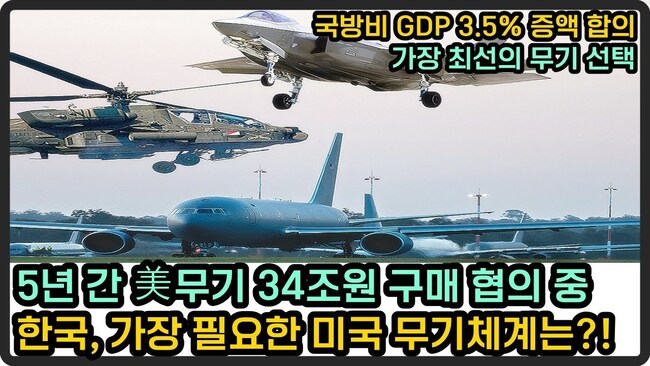 한미 정상회담에서 미국산 무기 선제 구매의사 표명, 그리고 최근 국내총생산 GDP의 3.5% 수준으로 증액하기로 알려짐. 2030년까지 약 250억 달러(약 34조 원) 규모를 구매하는 방안을 협의 중. 만약 이왕 도입할거라면 가장 최선의 선택이 될 미국무기체계는? 예상 미국산 무기 도입 리스트 : AH-64E 아파치 가디언(추가 도입)/ KC-46A 공중급유기(추가)/ P-8A 포세이돈 해상초계기(추가 6~9대 언급)/ E-7A급 공중조기경보통제기(AEW&C)/ CH-47(친누크, 롱레인지 구성) vs CH-53K/ MH-60R(해상작전헬기) 2차분/ 드론·무인기, 제즘ER, SM-3 미사일 등/ 현실적으로 필요한 미국산 무기체계 선택과 집중 시기.