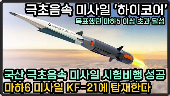 국산 극초음속 미사일 시험비행 성공 마하6 미사일 KF-21에 탑재한다 국방과학연구소(ADD)를 중심으로 한 개발 사업으로 한화에어로·현대로템 등 방산·연구기관이 참여한 '극초음속 복합영역 비행체' 프로젝트. 시험에서 최고속도 마하 6, 최고 고도 약 23 km에 도달, 목표했던 마하5 이상 초과달성. 국·내외 뜨거운 관심 받는 이유.