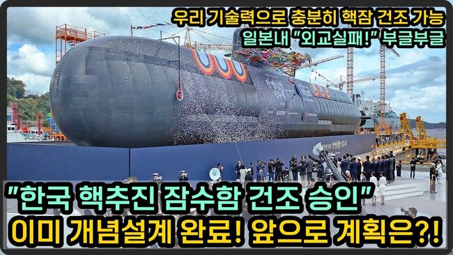 "핵추진 잠수함 건조 승인" 30년간의 숙원 마무리되다 한화오션, 이미 개념설계는 완료. 우리 기술력으로 충분히 핵추진 잠수함 건조가능. 도널드 트럼프 미국 대통령이 한·미 정상회담 다음 날인 30일 한국의 "핵추진 잠수함건조를 승인"했다고 전격 발표. 군용 잠수함은 고농축우라늄(HEU) 혹은 특수연료가 필요해 한·미 간 연료 공급·농축 허용 범위가 핵심 협상 대상. 우리 기술력으로 충분히 핵잠 건조 가능. 일본내 "미국과 외교실패!"에 부글부글 속 불편한 중국 러시아 북한 일본 자체 핵추진 잠수함 건조 기술력은 얼마나 되는가? 앞으로 진행되어야 할 과정 향 후 건조 계획과 방법, 비용 등 어떻게 되는가? 만약 핵추진 잠수함 건조하게 되면 앞으로 우리의 전략은?