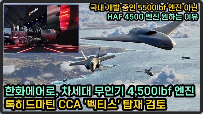 한화에어로스페이스 차세대 엔진, 록히드마틴 CCA 스텔스 무인 전투기 '벡티스' 탑재 여부. Vectis(벡티스)란? — 개념·목적·개발 현황. HAF4500은 무엇인가? 왜 후보로 거론되나? 국내 개발 중인 한화의 5500파운드급 엔진이 있는데, 왜 4500파운드 엔진을 원하는가? HAF4500 채택 시 장점(수출·공급망·성능)과 현실적 제약(통합·인증). 한국의 CCA(로열 윙맨) 개발 수준과 향후 전망. 한화에어로스페이스의 차세대 터보팬 엔진이 미국 방산기업 록히드마틴의 스텔스 협동 전투 무인기(CCA) '벡티스(Vectis)'에 탑재될 가능성이 제기. 벡티스는 F-35와 같은 유인 전투기와 팀을 이뤄 정밀 타격, 전자전, 정보·감시·정찰임무 등을 수행하는 설계된 고성능 스텔스. 록히드 마틴은 2027년 윌리엄스 인터내셔널 FJ44-4A 터보팬 엔진을 장착한 벡티스의 시험 비행을 계획 중이나 벡터스의 생산 가용성을 높이기 윌리엄스 엔진 외 교체 후보를 검토 중. 월리엄스 엔진은 여러 경쟁 CCA 기종과 다수 소형 상업용 제트기 체택. 벡티스에 한화에어로스페이스의 HAF-4500 탑재 염두 이유, 목표 추력 4,000–4,500 lbf 추력대비 추력대, 전자전이나 고전력 장비 사용에 필요한 약 100 kW급 전력 출력이 나옴.
