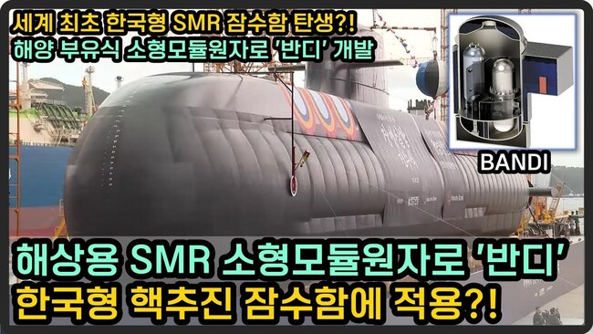 세계 최초 한국형 SMR 잠수함 탄생?! 해상용 소형모듈원자로 '반디' 개발, 한국형 핵추진 잠수함 적용 될까? 한국은 현재 육상 발전용 i-SMR(170MWe)과 해양용 BANDI(60MWe) 원자로 두 가지 플랫폼 개발 중. 특히 BANDI SMR 현대 핵잠수함 일반적인 추진 요구 사항(50~60MWe)과 일치하는 출력을 가지며, 해양 및 수중 응용 분야에 맞게 특별 제작 개발. 2블록 구조(원자로 블록 + 증기 발생기 블록)로 구성되며, 높이는 약 15m로 잠수함 선체에 맞게 최적화될 가능성 높음 5% 미만의 저농축 우라늄을 사용하며 재장전 주기 약 5년 주기. 이번에 건조 된 장보고3 배치2 '장영실함' 높이와 해상용 SMR반디의 높이가 비슷한 건 우연일까? 만약 SMR을 탑재한 잠수함을 건조한다면, 세계최초 핵추진(원자력)잠수함에 소형모듈원자로를 탑재하는 사례가 됨. 기술적인 측면에서 해결해야할 시험과제와 외적으로 풀어야할 과제는 무엇인가? 한국형 SMR 잠수함의 모습은 어떠할까?